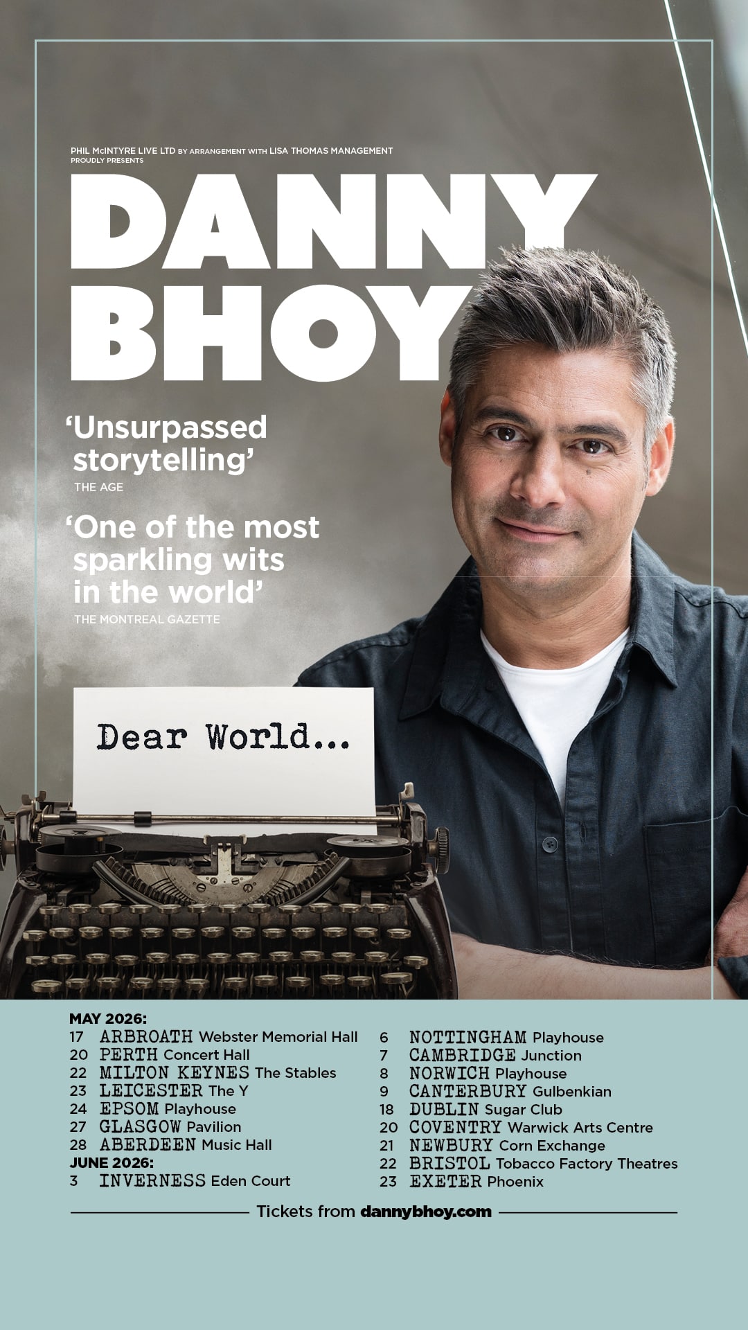 Danny Bhoy brings his sellout London, Edinburgh & Montreal Comedy Festival 2025 show, Dear World, to venues across the UK.